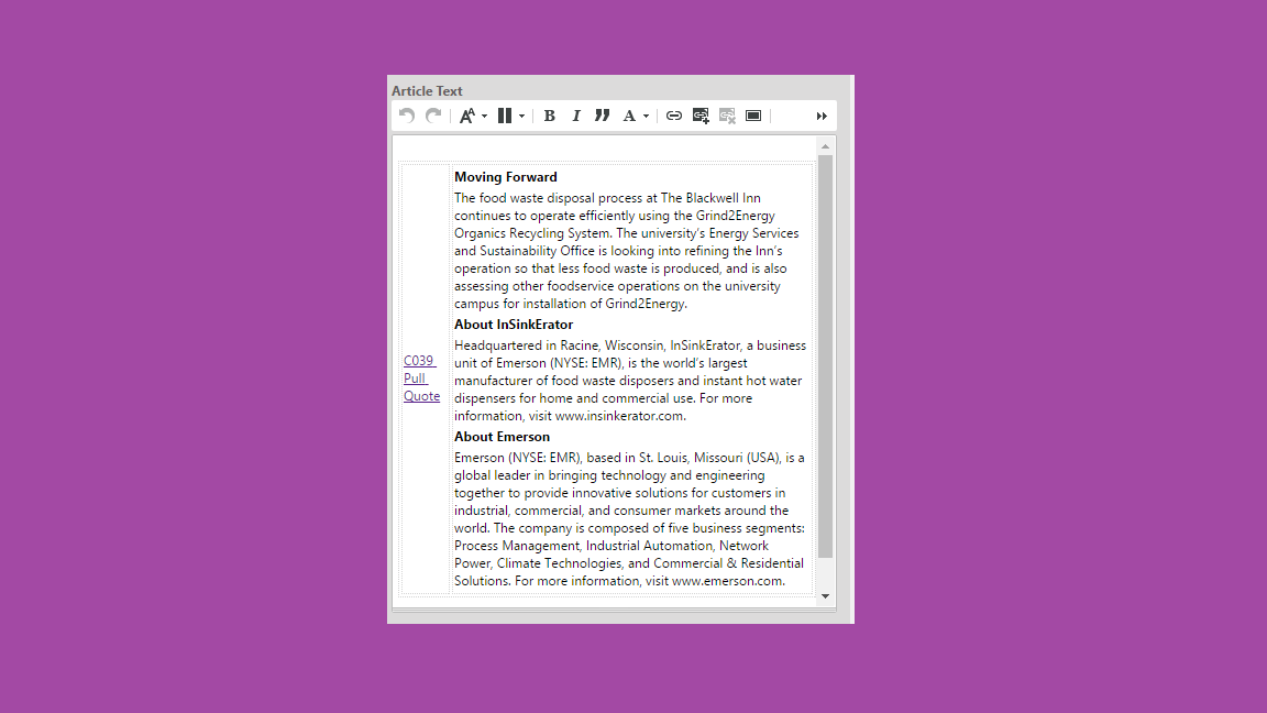 A special design was created for Emerson.com to allow for more “editorial” style pages to be created. This is one of the few instances on Emerson.com where we have “left rail” content on desktop view. On mobile view, the left rail is moved in-line with the main body content. The case study layout consists of a special hero (H008, H008B) and uses the rich text editor to create a two-column format with call-out information in the narrower left rail with the main long-content body copy in the wider right column. Additionally, there are a couple of components designed specifically to span the full width for images and tables.
