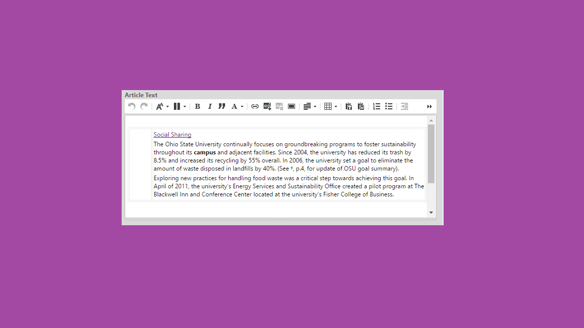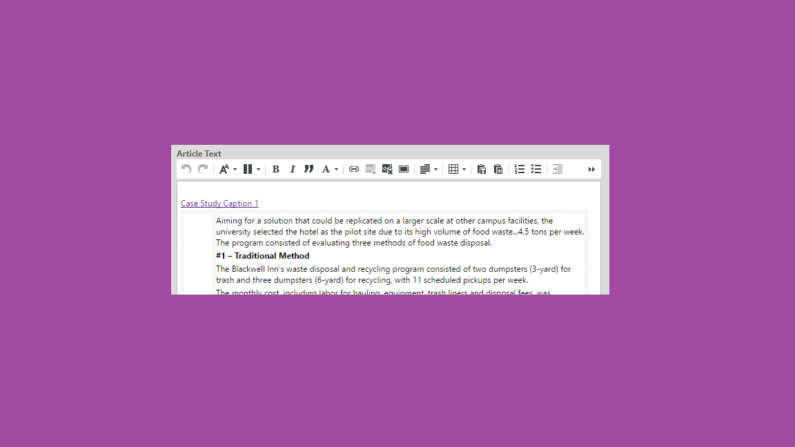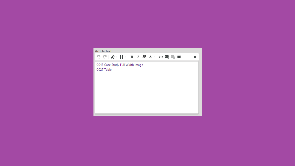 To add a component to the left rail, click in the left half of the case study grid and type a descriptive text. This text is for author reference only and will not show in your authored component. Highlight the descriptive text you just typed and click on the “create or edit a link to a content item” in the tool ribbon of the rich text editor. Then drag and drop the appropriate component from the library or drag the tab if the content item is open in Studio. Before closing the pop-up window, make sure the Link Behavior is set to “Show Embedded”. On the right side of the case study grid, add the corresponding body copy.