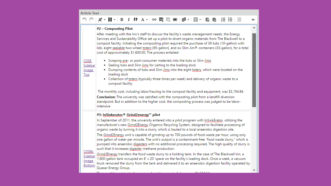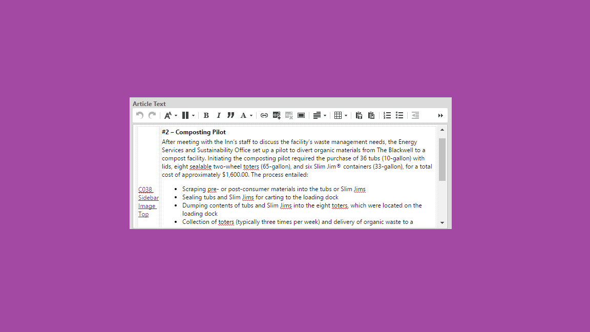 To properly setup a C038 sidebar image, use a grid with the appropriate component (C038 or C038b) on the left side of the grid and the text on the right. Note that the image will float to the top of the grid when rendered putting it in line with the top of the text on the right. A specific use case for the news is to allow for a hi res version of the image to be available for download. See the author instructions in the link above for information on how to author this.
